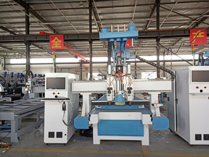 The pneumatic four heads cnc machine have 4 spindles and supports automatic tool change processing within four knives. Both the cabinet and the door can be considered. However, we all know that processing cabinets need to be punched at various positions with different apertures. If it is a relatively simple cabinet, then pneumatic 4 heads cnc machine can be implemented. If it is a complicated cabinet and the production volume is relatively large Next, the pneumatic 4 heads cnc machine cannot be realized. At this time, the double spindles drilling machine is needed.