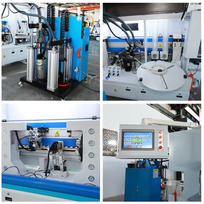 Beam press feeding – baking lamp preheating – board pre-milling (diamond 4+4 large angle pre-milling cutter) – baking lamp – sixth-generation new sealing PUR special glue pot dual-color glue machine without cleaning (easy to clean, full Teflon coating, new flow channel design for convenient glue cleaning) – conventional pressing – first set of extended belt non-powered vertical shaft pressing (independent design) – front and back trimming (with pressure relief function, better for thin aluminum skin) – dual-wheel pressing – upper and lower rough trimming (upper and lower diamond four-tooth) – upper and lower fine trimming (upper and lower diamond six-tooth) – four-head tracking chamfering – upper and lower edge scraping (diamond scraper with directional blowing) – flexible edge scraping – wire breaking – post-cleaning device – 1 upper and lower polishing – 2 upper and lower polishing.